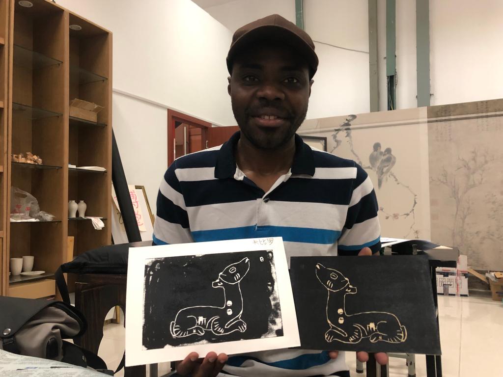 李云的讲座激发起留学生们亲手制作一幅中国版画的兴趣与热情。他们将自己喜爱的带有中国元素的图案画在木板上,依据线条的长短选择不同的刻刀,耐心细致地一刀一刀切割线条。木刻版画样板成型后,留学生们用滚轮将油墨均匀地滚在木板上,用木蘑菇将木板上的图案摩擦拓印到白纸上。当白纸从木板上揭下来时,留学生们惊喜地发现木板上的刀刻绘画形象呈现到纸张上,画面清晰明朗,凸显着一种稚拙、朴素的美感。他们感叹这一转换过程的奇妙,也感叹中国木刻版画丰富的文化内涵。