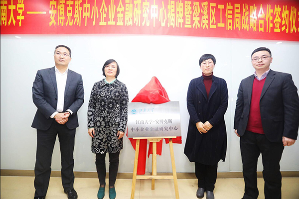 【中国江苏网3月16日】3月16日下午,江南大学-安博克斯中小企业金融研究中心(以下简称研究中心)揭牌暨梁溪区工信局战略合作签约仪式在江南大学隆重举行。会上,梁溪区工信局与新成立的研究中心签订首个战略合作协议。梁溪区工业和信息化局局长秦如平,校方、企业方负责人出席会议。