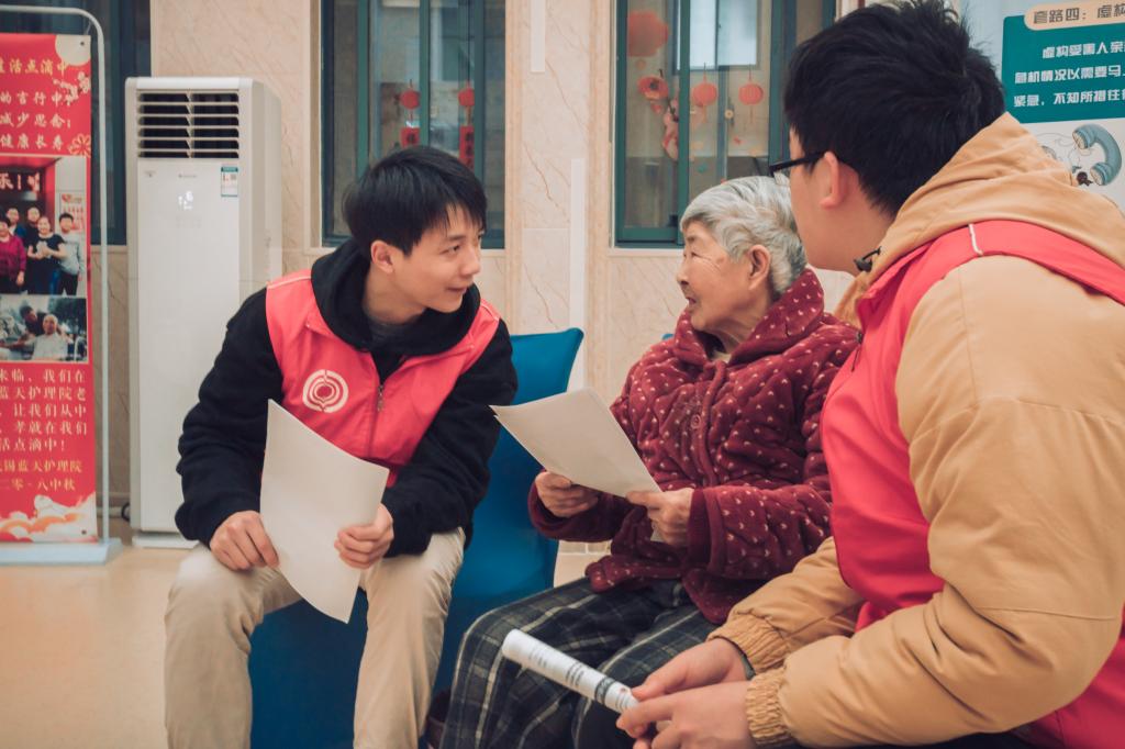与此同时,另一分队来到了百岁病房,看望101岁的老人顾蓉初。顾老先生年事已高,但是身体依然十分硬朗,他拉着志愿者的手,热切地与志愿者聊起在养老院的生活,皱纹中满是笑意,并鼓励同学们继续做这样有意义的事情。在志愿者们短暂的会合之后,同学们分组进入老人们生活的房间参观,并进一步对老人们进行防诈骗知识的宣传,与老人们进行热情的交谈。