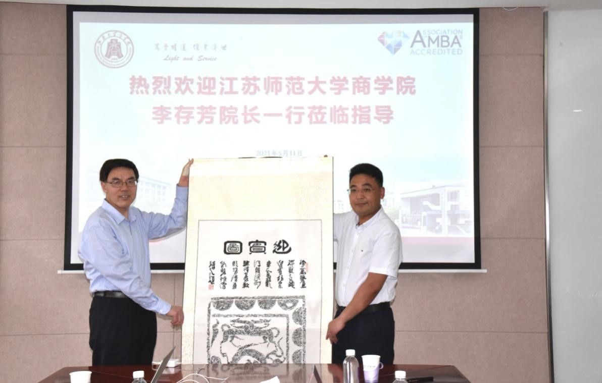 李存芳对学院的经验分享表示感谢,并对学院近年来取得的建设成效充分肯定,希望今后在学科建设、专业建设、人才培养等方面加强交流与合作。此次交流活动,加强了兄弟院校的沟通和了解,增强了校际交流,对促进两院的共同发展起到了积极的推动作用。会后钱吴永代表学院接收了江苏师范大学商学院赠送的徐州汉画像石拓片竖轴《迎宾图》。