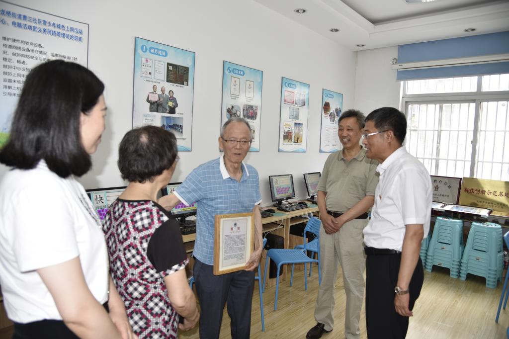 在江苏省老科协科普教育基地——姚鸿滨公益电子阅览室,陈卫听取了姚鸿滨关于目前服务社区居民、助力社区党建工作的情况,以及发挥自己所长不断为社会、为学校、为老同志服务的思考与实践。陈卫对姚鸿滨坚持离岗不离责、退休不褪色,主动请缨加入老科协,十几年如一日投入到社会公益服务、教学科研中去,并为援疆支教付出的巨大努力给予高度赞赏,充分肯定这些突出成绩都是一步步干出来的,真正体现了“老有所为”,仍可大有作为。