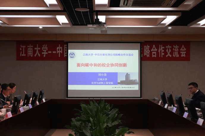 焦阳简要介绍了催化剂公司的总体情况,对我校在食品、轻工领域的学科实力给予高度评价,并积极评价化学与材料工程学院在表面活性剂、化妆品和功能材料等相关领域的影响力,特别是刘小浩教授团队近几年围绕习近平总书记提出的“2030碳达峰/2060碳中和”相关研究领域做出的开拓性工作引起了学术界和行业的关注,催化剂公司对此产生极大的兴趣。接着董玉明介绍了化工学院的情况,刘小浩做了题为“面向碳中和的校企协同创新”的学术交流报告,并同与会人员开展了深入的讨论,初步确定了战略框架协议合作内容,以及合作的具体切入点。交流会后,焦阳一行参观了化学与材料工程学院刘小浩教授团队的洁净能源与化工催化实验室。
