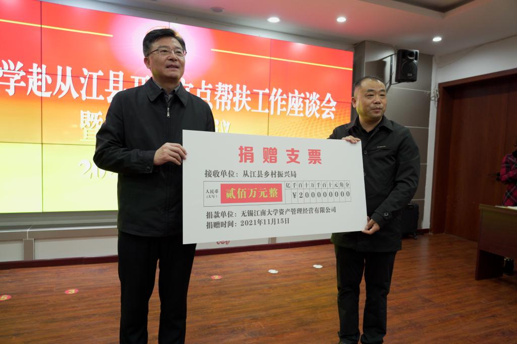 随后,我校外国语学院院长方文开通报了帮扶项目《侗族大歌志》翻译进展情况。在捐赠仪式上,江南大学捐赠帮扶资金200万元。在座谈交流环节,我校各校友会负责同志积极发言,针对从江自然环境、文化禀赋及经济社会发展实际,从产业发展、文化传播、生态旅游、项目合作等多方面提出意见和建议,双方就如何在乡村振兴的时代背景下推进深度合作达成了广泛共识。