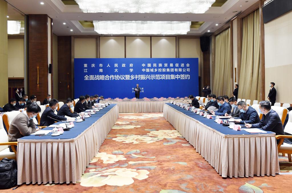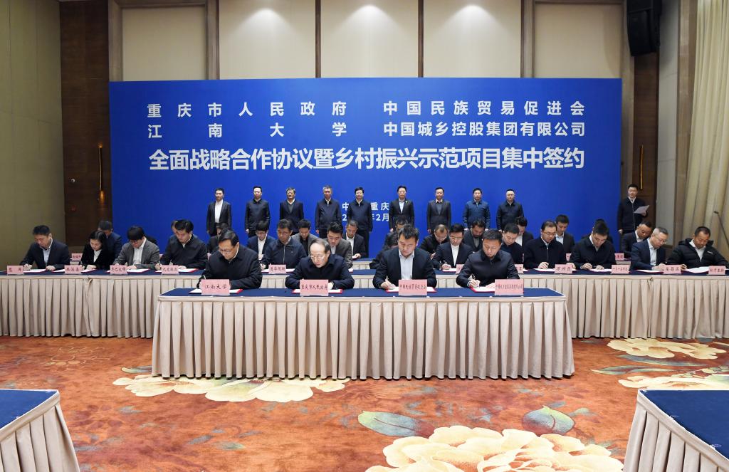 2月15日上午,江南大学、重庆市政府、中国民族贸易促进会、中国城乡控股集团四方全面战略合作协议暨乡村振兴示范项目集中签约活动在重庆举行。重庆市委副书记、市长胡衡华与中国民族贸易促进会会长蓝军,中国工程院院士、江南大学校长陈卫,中国城乡集团控股有限公司董事长胡国丹共同见证签约并举行座谈。江南大学副校长吴正国代表学校签约,校长办公室主任张梁、科学技术研究院院长范大明、江南大学国家安全与绿色发展研究院院长陈红等出席活动。