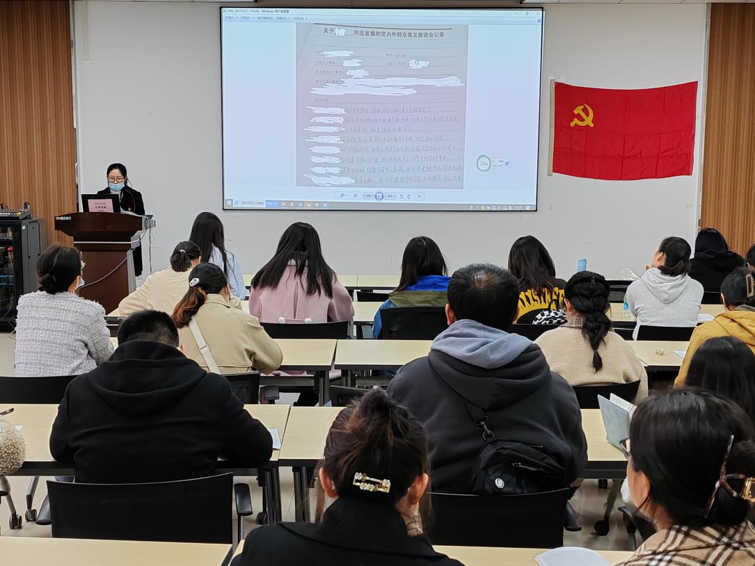 随后,胡卉君详细解读了《江南大学发展党员工作实施细则》。她介绍了学院学生党员的总体情况,对在场的基层党务工作人员培训了党员发展流程和党员发展材料撰写要求,强调了发展党员工作的注意事项等。最后,张任就近期党建工作予以提示,详细介绍了组织生活月报表的填写要求,她强调各支部要严肃对待近期开展的民主评议工作。