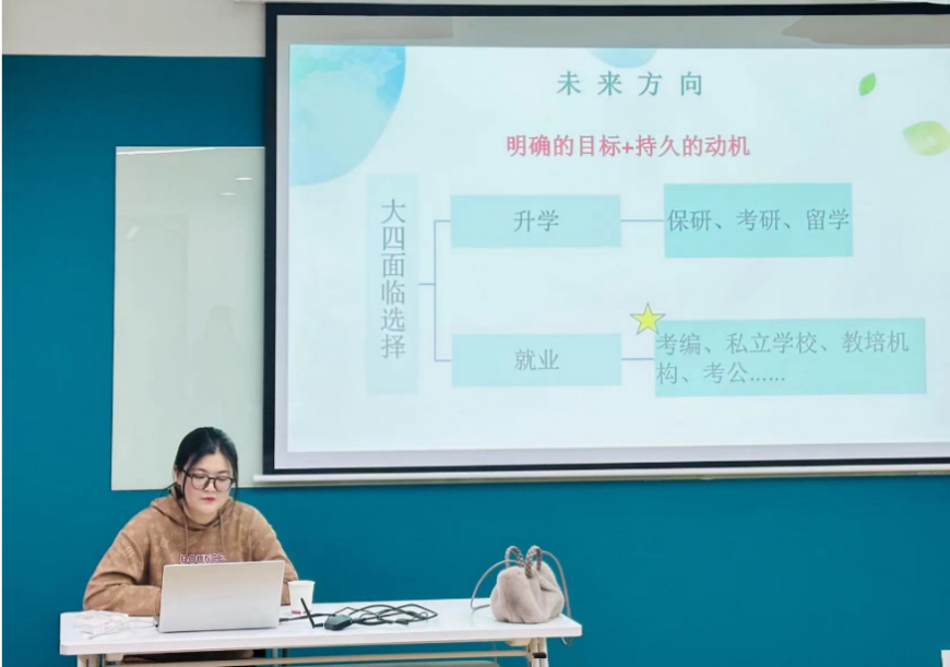 最后,蒋丽君从“个人”和“政策”两个维度提出建议。在个人层面,抓住机会积累经验,提升自身专业能力,注重师范生技能培养;同时专注自身,放平心态,保持自信。在政策层面,鼓励同学们拓宽信息搜集渠道,提前了解政策、解读政策。