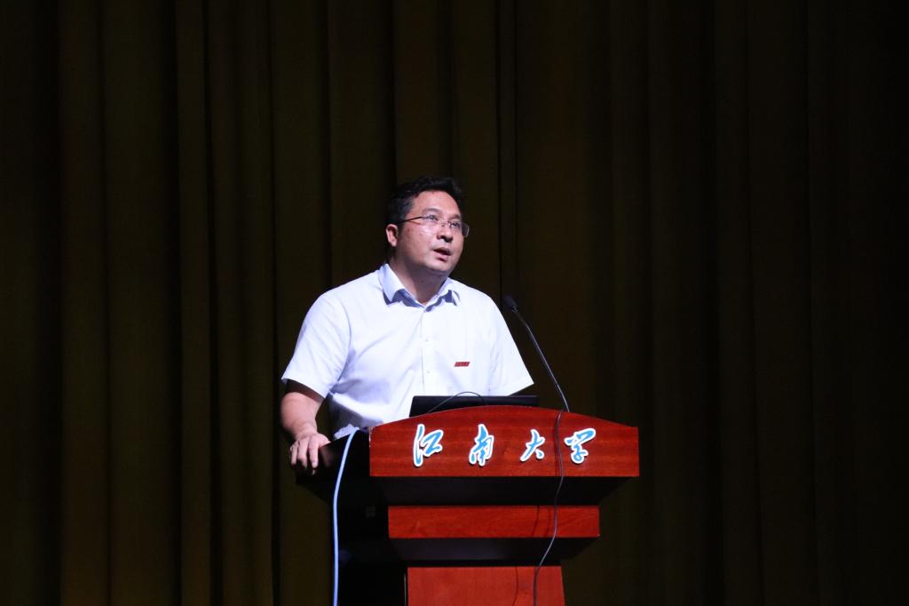 人文学院2005届校友,无锡市雪浪中心小学副书记、无锡市教学能手石瑶讲述了自己在江南的求学故事,并以学姐的身份亲切提出要积极参加活动、认真对待学习、建立良好关系的三点贴心建议,鼓励新生们在大学期间努力学习,不负青春。