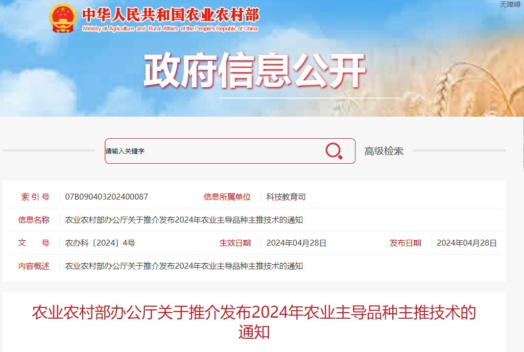 近日,农业农村部办公厅印发《关于推介发布2024年农业主导品种主推技术的通知》(农办科〔2024〕4号),文中推介发布了10项重大引领性技术、150个农业主导品种和150项主推技术。