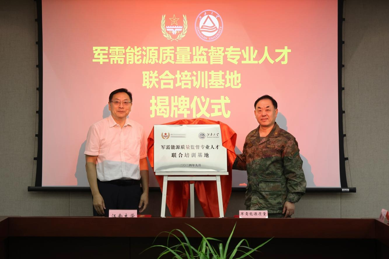 近日,江南大学—联勤保障部队军需能源质量监督专业人才联合培训基地签约暨揭牌仪式在我校举行。联勤保障部队某总站党委书记(军方领导),我校党委书记吴正国、党委办公室主任王维、教务处处长兼本科招生办公室主任李兆丰、食品学院党委书记傅莉莉、纺织科学与工程学院党委书记张菁燕等出席仪式。仪式由傅莉莉主持。