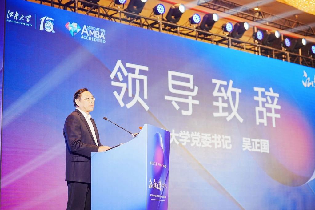 论坛伊始,吴正国致辞。吴正国对长期以来给予江南大学和江南大学商学院关心、支持和帮助的各位领导专家表示了衷心感谢,并介绍了江南大学和江南大学商学院发展情况。他表示,江南大学MBA作为江南大学研究生特色教育项目,始终致力于以厚植江南工商文化,立足中国管理实践,贡献商科学术新知,培养未来商业领袖赋能地方经济发展。最后,吴正国预祝本次高峰论坛活动取得圆满成功。