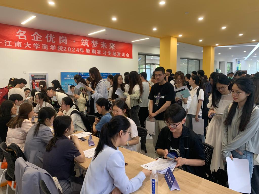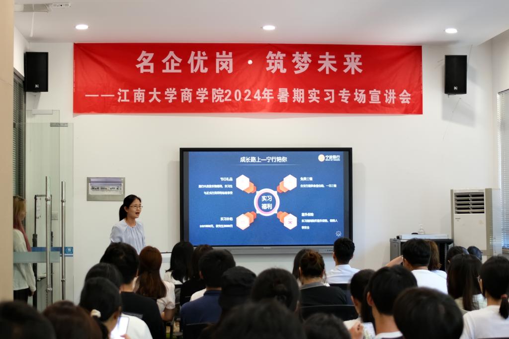 为贯彻落实党中央、国务院关于做好高校就业工作决策部署,扎实推进江南大学“奋进计划”中保就业、促就业相关要求,提前谋划2025届毕业生就业工作,以暑期实习促进大学生高质量充分就业,近日,商学院邀请国联证券、顺丰集团、远东集团、江苏银行、宁波银行、招商银行、无锡市高新人才集团、可口好粮等8家在锡企业面试官代表走进江南,亲临现场在北区大学生活动中心开展“名企优岗,筑梦未来”暑期实习生专场宣讲会。江南大学就业指导中心副主任胡国顺、商学院党委副书记兼副院长徐静、辅导员孙旭媛、吴松和150余位商学院本硕学生参加活动。