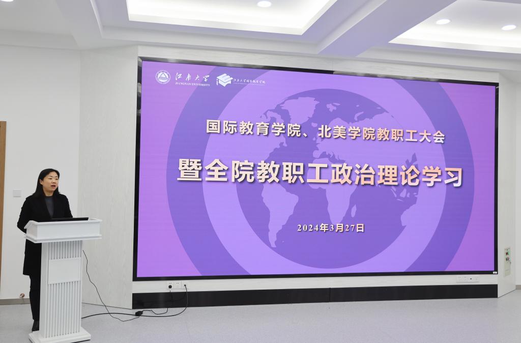 3月27日下午,国际教育学院、北美学院召开全院教职工大会暨教职工政治理论学习,会议由党总支书记王晖主持。