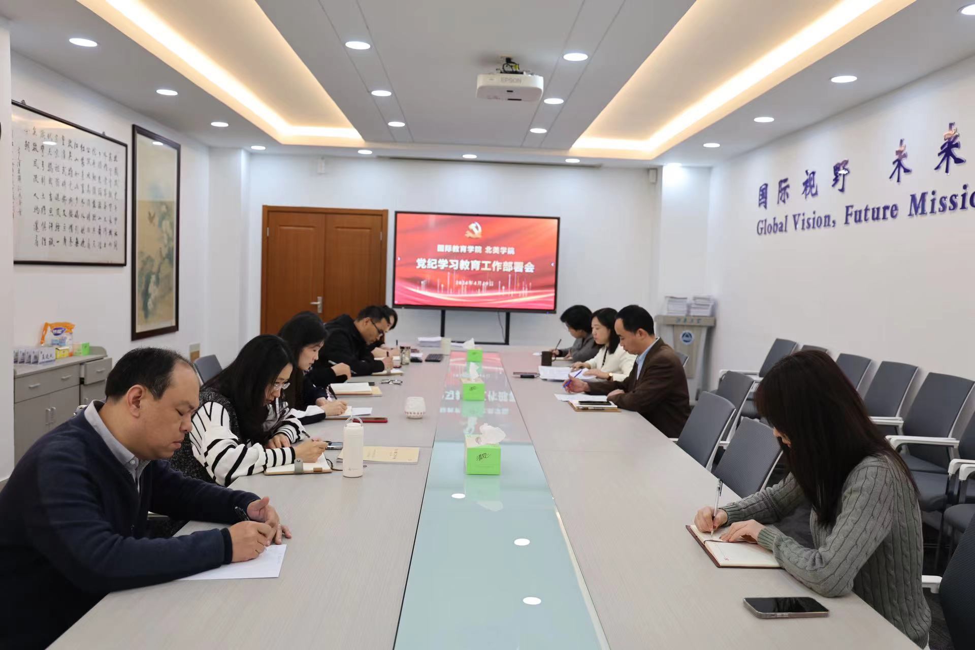 4月19日上午,国际教育学院、北美学院在学院B306会议室召开党纪学习教育工作部署会,院党总支副书记、纪检委员、全体党支部书记、党支部委员、科级干部参加,会议由党总支书记王晖主持。