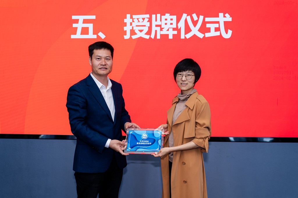 胡伟峰与俞萍进行授牌仪式。授牌仪式的顺利举行,不仅是江南大学与雅迪集团合作的一个新的起点,也是双方共同发展的一个新的契机,为社会培养更多优秀人才,为产业发展注入新的活力和动力。