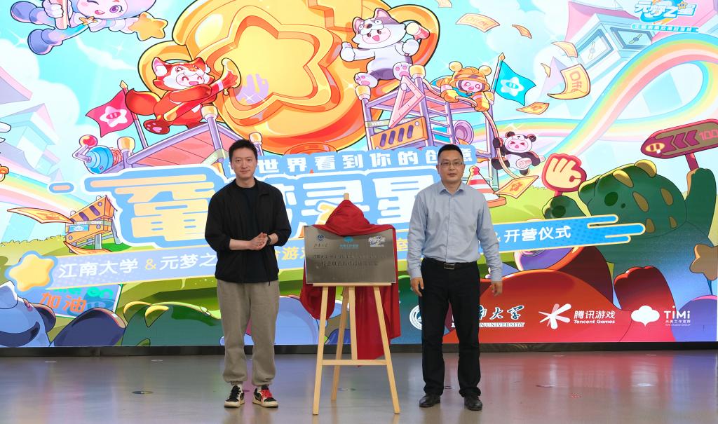 在致辞结束后,负责人叶辉和设计学院党委书记王维青为“江南大学&元梦之星联合游戏设计实验室”隆重揭牌,标志着本次校企联合项目正式启动。