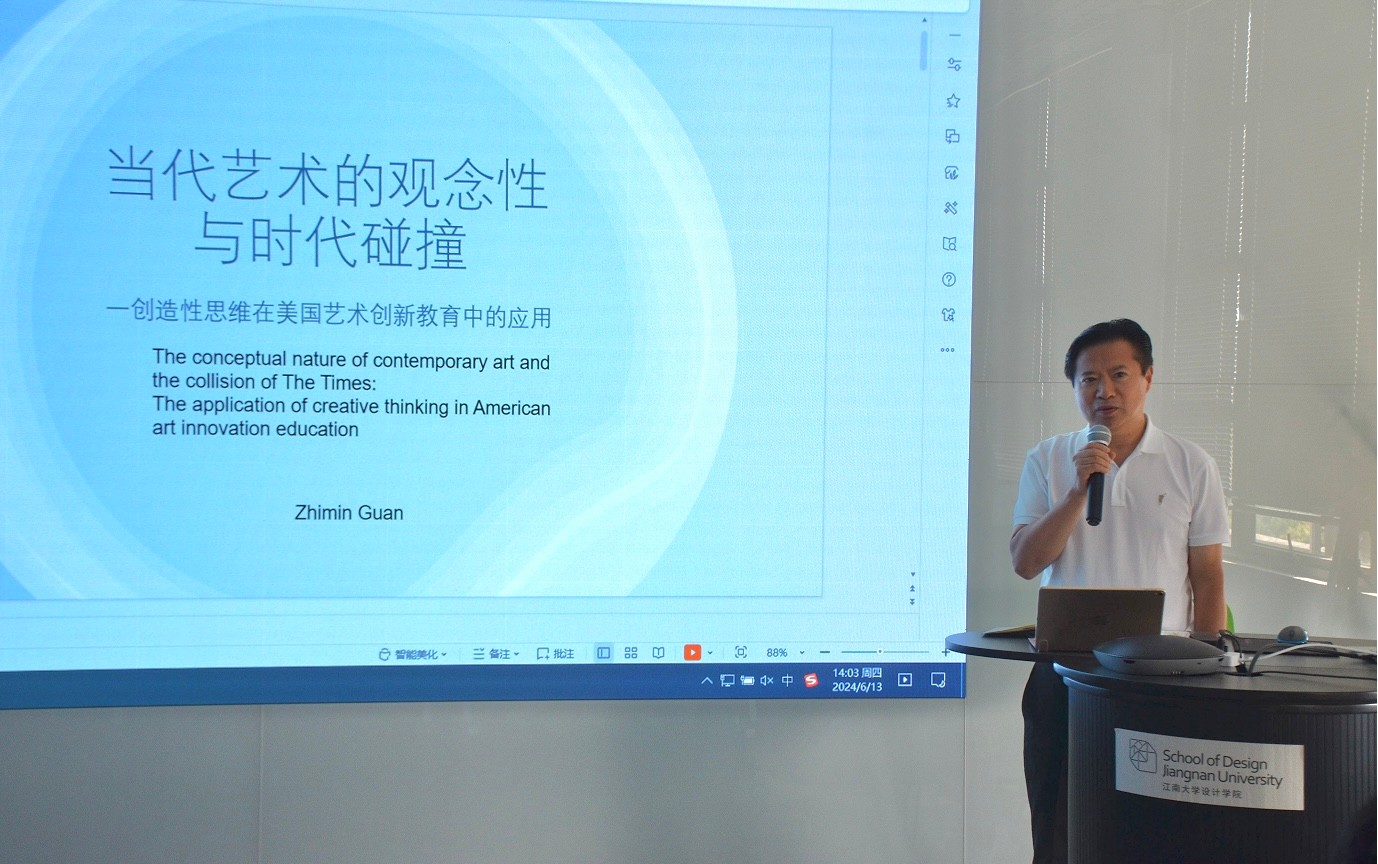 6月13日下午,美国明尼苏达州立大学艺术学院终身教授,全美华人美术教授协会主席关智民老师受邀来访江南大学设计学院,在学院C510报告厅作题为“当代艺术的观念性与时代碰撞—创造性思维在美国艺术创新教育中的应用”的学术讲座。本次讲座由公共艺术与美术系副教授徐晴主持,学院党委书记王维青出席讲座现场并致欢迎辞,公共艺术与美术系副主任杨永俭、副教授杜力及其他高校教师代表参加了讲座。