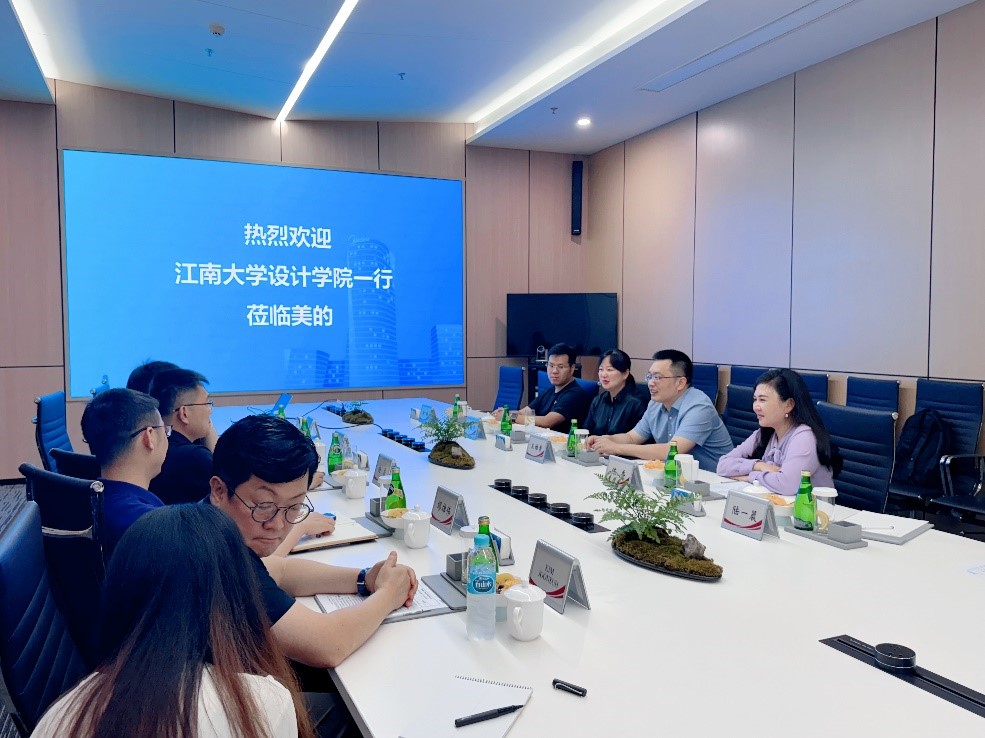 8月12日,由江南大学设计学院党委书记王维青带队,中国轻工业工业设计重点实验室主任周敏宁教授、工业设计系李瑞副教授、陆一晨副教授、产品设计系陈香副教授一行访问美的集团,洽谈校企深度合作、科技创新、协同育人、共建数智联合实验室相关事宜。美的集团副总裁兼家用空调事业部总裁赵磊、家用空调事业部研发体系主任缪雄伟、家用空调事业部运营与人力资源总监孙昱寰、家用空调事业部研发体系工业设计部长KIM JOONSUH、家用空调事业部研发体系工业设计高级工程师张艳参加会谈。