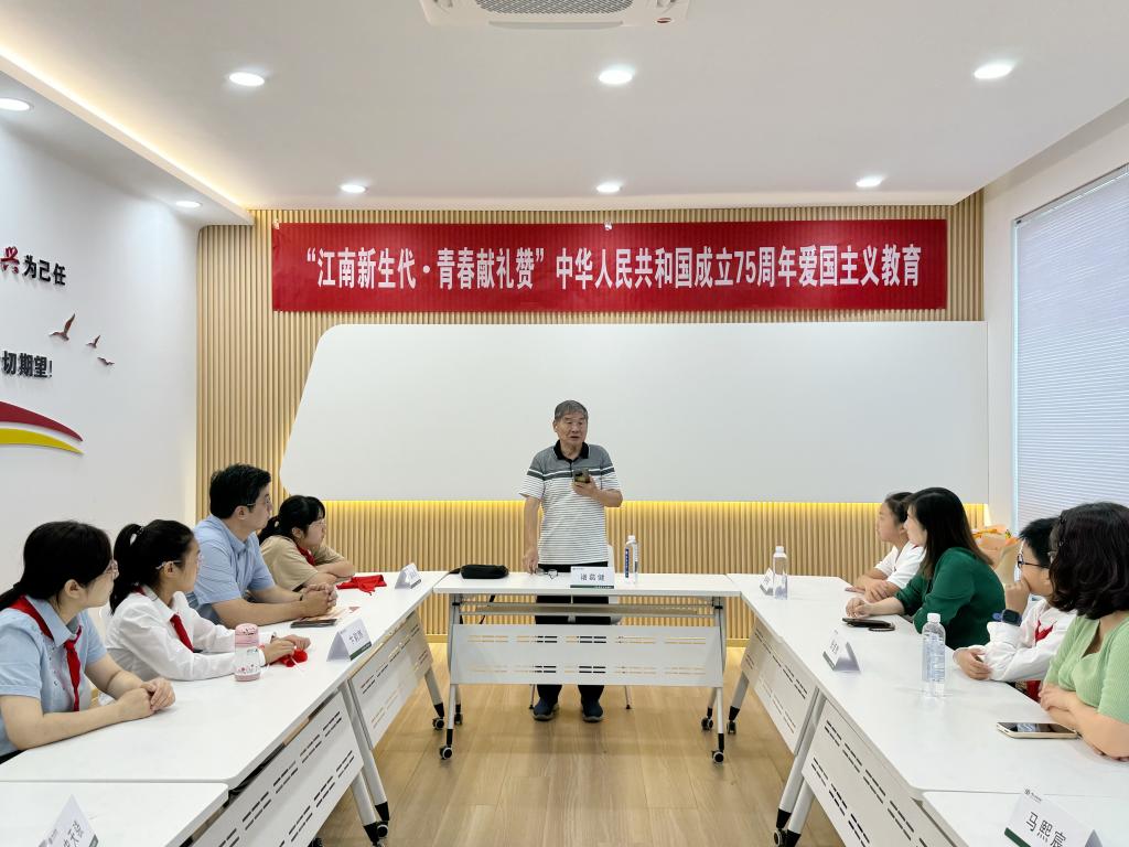 诸葛健老师以“我是中国人,我爱中国,我希望中国繁荣昌盛”的响亮口号表达了江南生工人对祖国的深情与承诺,接着他以自身“少先队员岁月”“海外求学”“攻坚克难技术瓶颈”等话题分享爱国情怀,激励新一代青年学好核心知识、报效祖国。随后,教职工子女代表詹凌萱、周沐凡为诸葛健老师献花、敬献红领巾。最后,诸葛健老师为参加活动的教职工子女颁发爱国主义课堂结业证书。