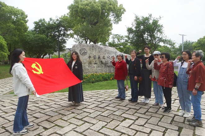 党旗所指就是团旗所向。为鼓励新时代中国青年团结凝聚在党的周围,以昂扬向上的精神风貌在中国式现代化建设中挺膺担当,坚定青年党员和团员听党话、跟党走的决心,4月27日,机关离退休第三党支部、社桥离退休党支部的部分老党员与外国语学院英语本科生党支部党员、雷锋特称团支部、张闻天特称团支部团员,赴无锡泰伯陵以及鸿山遗址博物馆联合开展“老少携手,党团共建”主题实践活动。