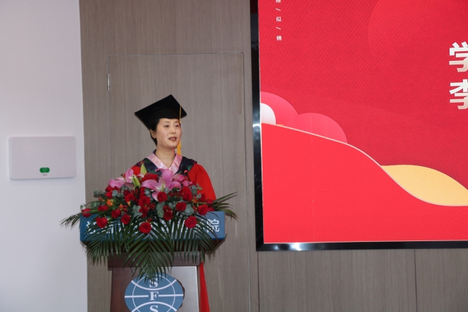 接下来,外国语学院党委书记李荣华发表毕业寄语。首先,李荣华对毕业生们表达了真挚的祝福,对老师和家长们表示了衷心的感谢。随后,他回顾总结了外院2024届学子一路走来的成长与收获,赞扬了大家砥砺奋斗取得各项成绩。最后,李荣华分享三点:致知,做深学笃行的学习者;致行,做知行合一的践行者;致远,做创新有为的奋进者。寄语大家:肩负时代使命,提升专业本领,涵养家国情怀,形成全球视野,努力成为又红又专又雅的外语人,奋力书写为中国式现代化挺膺担当的青春篇章!