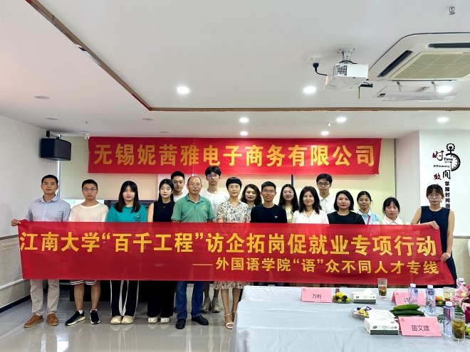 为深入贯彻落实党中央、国务院关于高校毕业生就业工作的决策部署,根据《江南大学2024年大学生就业工作实施方案》要求,7月11日上午,外国语学院党委书记李荣华、党委副书记刘伯贤、辅导员苗文建、朱家烨以及研究生、本科生代表前往无锡妮茜雅电子商务有限公司开展访企拓岗促就业专项活动。