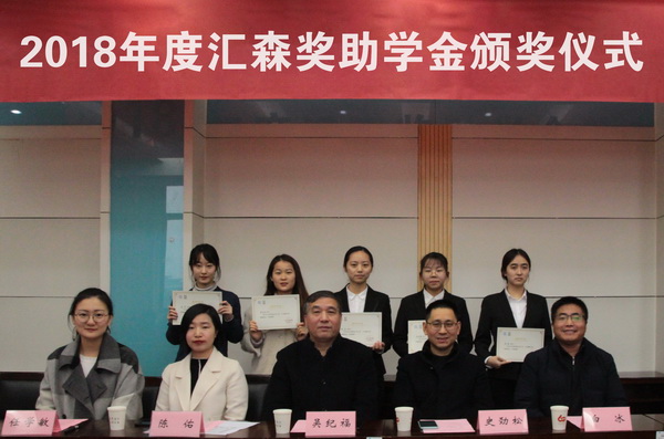 1月9日,2018年度江南大学药学院“汇森奖助学金”颁奖仪式在药学院306会议室隆重举行。汇森生物设备镇江有限公司财务总监吴纪福,行政人事总监陈佑,药学院副院长史劲松,院党委副书记、副院长白冰出席颁奖仪式。仪式由药学院分团委副书记任学敏主持,20名获奖学生及部分观礼学生代表参加了颁奖仪式。