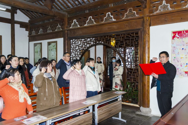 1月14日下午,师生党员来到了惠山古镇廉政文化教育基地。惠山存清风,正气满人间。坐落于惠山古镇的祠堂群文化底蕴深厚、文物古迹众多,其中有数十座“清官祠”。这里有清廉自守的唐代贤相陆贽的陆宣公祠,有留下千古佳句“先天下之忧而忧,后天下之乐而乐”的范文正公祠,有为官耿直,敢于直谏的顾可久先生祠。