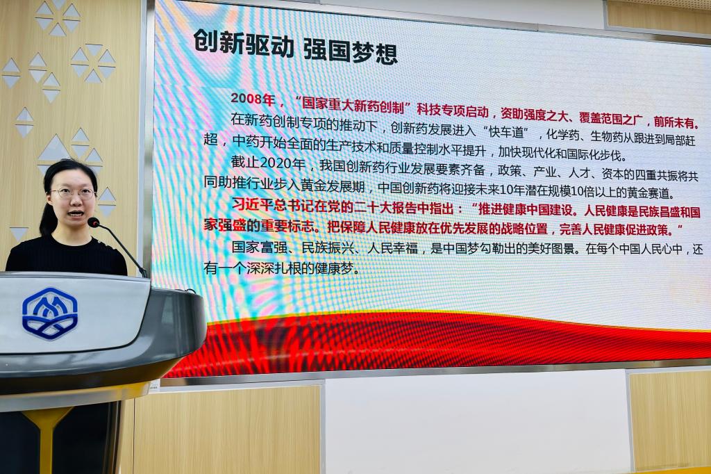 2022-2023学年校长特别奖、至善特别荣誉生奖获得者,本科生党支部副书记孙莹结合所学专业和支部实际,以“学波澜壮阔制药史 走健康中国奋进路”为题作微党课分享。她围绕“救亡图存”“百废待兴”“野蛮生长”“破旧立新”四个篇章,展示了百余年来中国制药产业从一无所有到制造大国的艰辛过程,呼吁新一代药学人担当起时代责任、勇于砥砺奋斗、练就过硬本领。