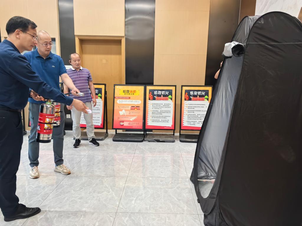 签字仪式后,全体教职工在学院一楼大厅进行了消防实战模拟演练。保卫科科长王世强现场演示灭火器的使用方法,与会老师逐一进行实操体验。