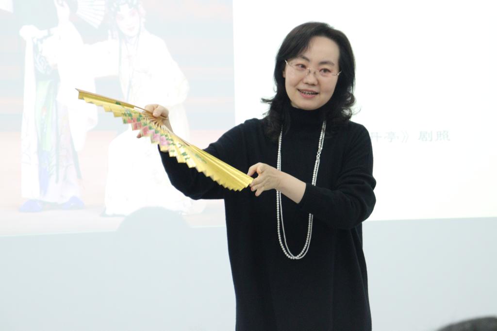 赵老师从曲调清雅、文辞典雅、表演优雅和格调高雅四个方面讲解了昆曲发展的历史、曲谱知识和昆曲声腔的特点。赵教授带领大家欣赏了《牡丹亭》《长生殿》《桃花扇》《孽海记》中的相关片段,她通过丰富的肢体语言和娓娓道来的故事,使听众对昆曲有了更深的认识,讲至兴起时,赵教授亲自上台示范昆曲中扇子的妙用并为在场的师生演唱了《牡丹亭·游园》中最经典的片段《皂罗袍》,在座的同学无不惊叹叫好、意犹未尽。最终,讲座在同学们的热烈掌声中落下帷幕。