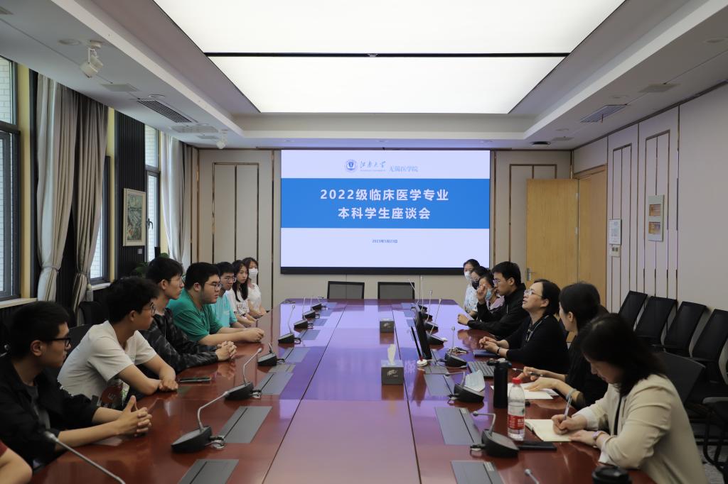 医学院于5月23日下午召开2022级临床医学本科生座谈会。医学院党委书记向琪,党委副书记、副院长包羽,副院长陈雪,副院长程洋,教务秘书孙洁芸,2022级辅导员鲁钦正出席座谈会,2022级临床医学本科生代表参加座谈会,会议由向琪主持。