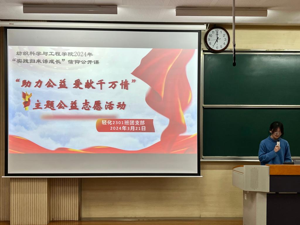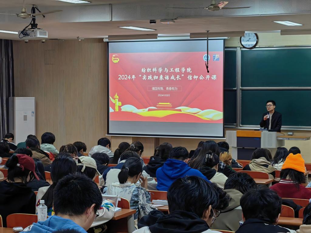 为贯彻落实习近平总书记关于青年工作的重要思想,3月25日晚,纺织科学与工程学院在一教1B103举办2024年寒假“实践归来话成长”信仰公开课。学院学工办主任兼分团委书记陈裕、2023级本科生辅导员孙婷婷、2024年寒假社会实践各院级重点团队代表、2023级全体本科生参与本次活动,会议由学院学生会团委通讯社葛子恒主持。