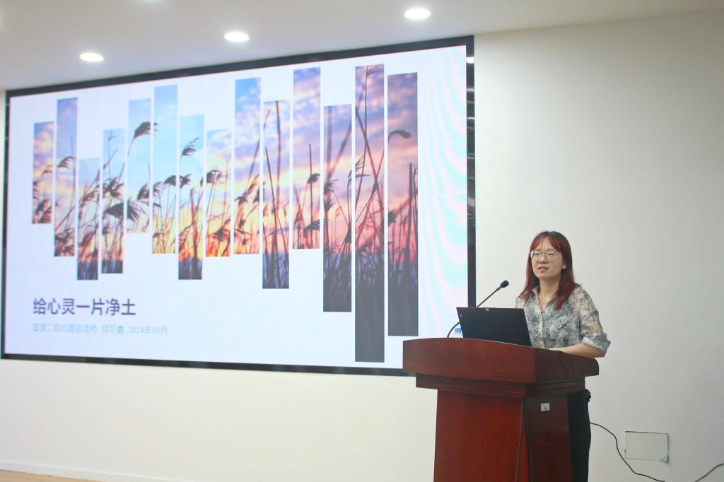 首先,缪可嘉以“还心灵一方净土”为题,从大学生心理健康数据结果分析导入,向大家科普了如何常识性区分心理健康与否、抑郁症的表现,通过大学生常见心理问题案例分析,并提出了保持心理健康的实用策略与方法,她引导同学们要正确面对学习和生活中的压力,学会情绪调节,自我疗愈,并详细介绍了学校心理咨询服务,鼓励新生们在面对心理问题时勇敢寻求专业帮助。