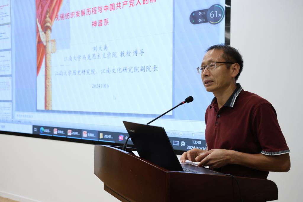 刘大禹以《无锡纺织发展历程与中国共产党人的精神谱系》为题作讲座。他首先从历史的角度分析了近代以来无锡为何能发展纺织业,其次介绍了以业勤、广勤、振新、豫康、庆丰、丽新、申三等7个大厂为代表的无锡纺织业的发展历程,最后生动阐释了无锡纺织业发展历程所彰显的开放包容、勇于变革、求真务实、济民裕国等企业家精神。近代以来,无锡以纱厂、面粉厂、丝厂为三大工业台柱掀起了轰轰烈烈的工商业实践,相继崛起了以杨、周、薛、荣、唐蔡、唐程等六大家族集团为龙头的民族工商业群体,这批商界先驱以敢为天下先的勇气主动为国担当、为民分忧,在波澜壮阔的历史进程中积淀形成的企业家精神,也成为中国共产党人精神谱系的重要组成部分。