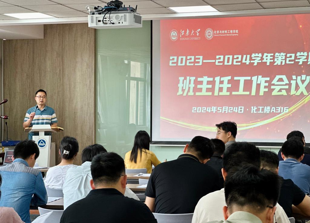 为贯彻落实学校、学院各项工作安排,进一步强化班级管理,提高班主任工作管理水平,5月24日下午,化学与材料工程学院在学院A316会议室召开了2023-2024学年春季学期班主任工作会议。全体辅导员、各年级班主任参加了本次会议,会议由学院党委副书记、副院长董霞主持,本次会议包括了学期工作安排、安全纪律要求、日常管理研讨、毕业就业动态、班主任考核条例修订等内容,会上发放了学期班主任工作资料,便于班主任梳理学期工作。