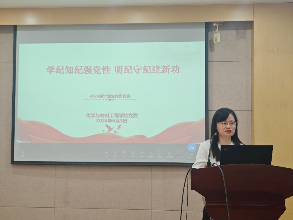为进一步抓实抓细毕业生党员教育管理工作,把好党员“出口关”。6月3日下午,化学与材料工程学院2024届毕业生党员教育在化工楼B329举行。学院党委副书记、副院长董霞,党建专职组织员张青,党建辅导员杨璇以及全体毕业生党员参加此次会议。