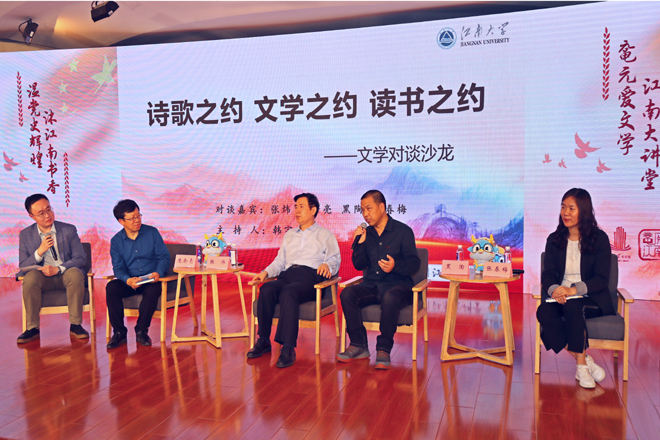 开幕式后,特邀请全国作协副主席、茅盾文学奖获得者、中国文坛著名作家---张炜老师做客鼋元爱文学江南大讲堂。做了题为《诗歌之约、文学之约、读书之约---著名作家张炜谈文学与阅读》的讲座,由阅读推广大使韩宇瑄老师主持。主题发言环节后,中国作家协会会员、扬州大学文学院客座教授庞余亮,人文学院张春梅教授,著名散文家、诗人庞培,一级作家、无锡市作家协会主席黑陶,与张炜共六位嘉宾围绕地域文化对作家的滋养、张炜先后出版不同文体图书的突破与收获、以及在五彩绚烂的世界中,世界观的形成和对当代大学生读书的建议等话题进行了圆桌式对谈与热烈而深入的讨论,现场气氛热烈。