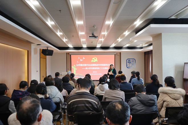 为全面深入学习贯彻党的二十大精神,切实把广大职工的思想和行动统一到党的二十大精神上来,12月6日下午,图书馆与档案馆在B区三楼鼋阅共享空间举办党的二十大精神专题学习会,邀请党委宣讲团成员、马克思主义学院唐忠宝教授作题为《以中国式现代化全面推进中华民族伟大复兴——学习贯彻党的二十大精神》专题报告。图书馆与档案馆中心组成员、全体党员、部主任、教职工代表参加,报告会由党总支书记曹瑛主持。