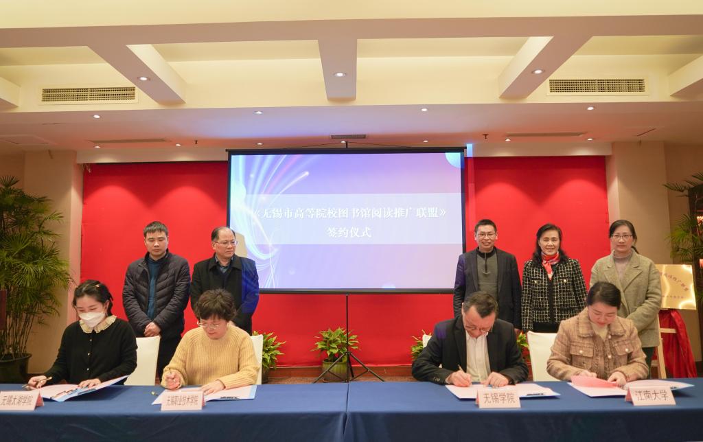 江南大学图书馆副馆长江琳娜宣读了《无锡市高等院校图书馆联盟章程》。随后钱军、卢立新、曹瑛、梁建共同为阅读推广联盟揭牌,11家无锡地区高等院校图书馆的负责人参加了签约仪式。