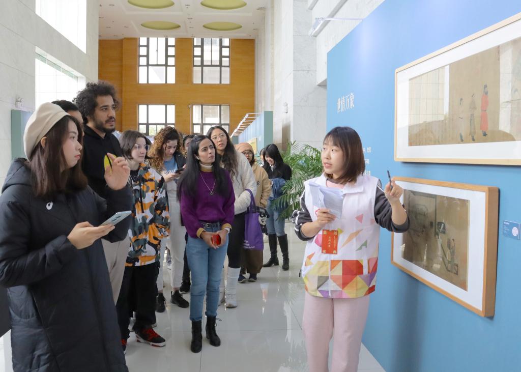 活动伊始,在英语志愿者讲解员带领下,留学生们参观了“中国历代绘画大系”的不同展区,共同了解历代重要名家画作及其背后的文化故事,欣赏《清明上河图》《千里江山图》《富春山居图》等中国十大传世名画代表作品,深入感受古代绘画艺术的内涵和精髓。参观中,留学生们认真聆听讲解员的介绍,细细观赏陈设的各类画作,同时就自己感兴趣的话题与讲解员进行交流互动。