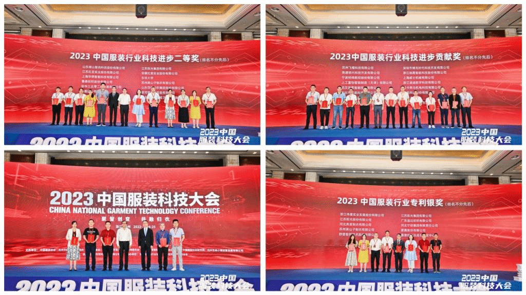 大会现场颁发了2023中国服装行业科技进步奖、2023中国服装行业科技进步贡献奖、2023中国服装行业年度科技创新人物、2023中国服装行业专利奖、2023服装行业优秀论文奖。波司登集团与江南大学合作的“高性能羽绒服装智能化制造关键技术及应用”项目,荣获中国服装科技进步奖一等奖;江南大学获科技进步贡献奖。江南大学沈雷教授团队研究生李国安《基于数宇技术的可充电保暖定位的登山服设计研究》获得2023服装行业优秀论文一等奖。