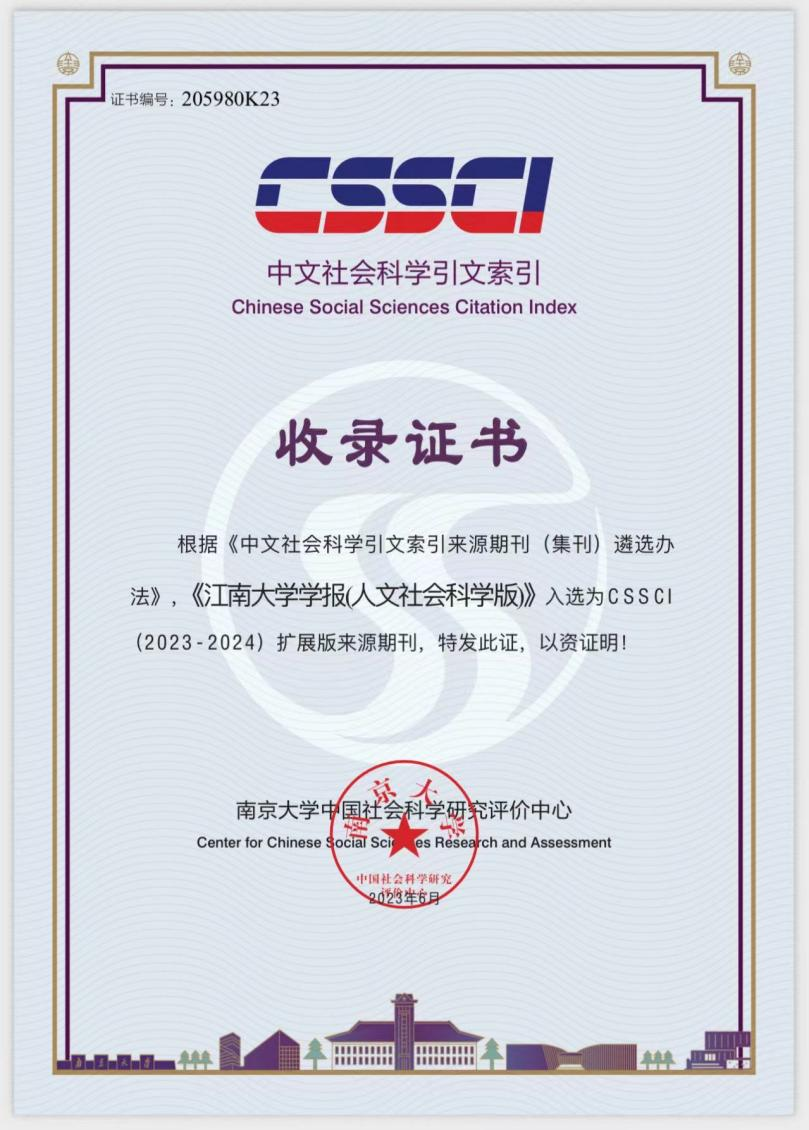 近日,《江南大学学报(人文社会科学版)》收到南京大学中国社会betway必威官方网站app评价中心发来的《收录证书》。根据《中文社会科学引文索引来源期刊(集刊)遴选办法》,《江南大学学报(人文社会科学版)》入选为CSSCI(2023—2024)扩展版来源期刊。这也是学报首次入选CSSCI扩展版来源期刊。