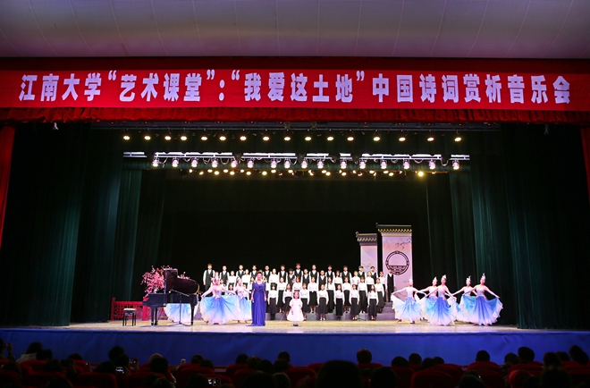 10月16日晚,江南大学“艺术课堂”之“‘我爱这土地’中国诗词赏析音乐会”在文浩馆观众厅举行。本次音乐会由党委宣传部、江南大学国家大学生文化素质教育基地、人文学院共同举办。人文学院音乐专业副教授管乐担任主讲人。