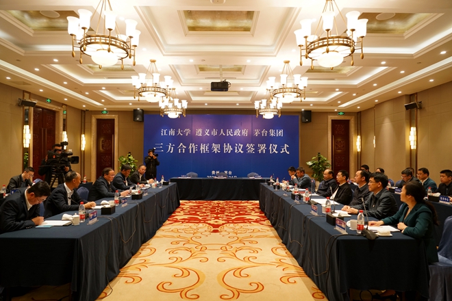 10月24日,江南大学、遵义市人民政府、茅台集团三方合作框架协议签署仪式在遵义举行。遵义市委书记魏树旺,遵义市委常委、仁怀市委书记黄兴文,遵义市副市长姚轶;茅台集团党委书记、董事长高卫东,茅台集团党委副书记、总经理李静仁,茅台集团总工程师王莉;校党委书记朱庆葆,校党委副书记、纪委书记刘淼,校党委常委、党委办公室主任、统战部部长朱飞,校长助理张光生,产业技术研究院院长刘龙等参加会议。会议由遵义市委常委、市委秘书长杜富川主持。