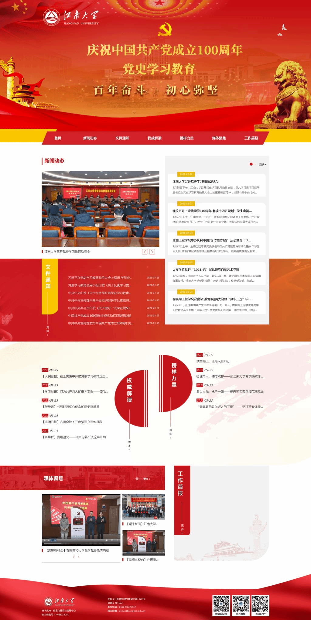 为深入贯彻落实党中央和教育部关于在全党开展党史学习教育的相关要求和工作部署,回顾党的百年初心、展现党的百年风华、致敬党的百年伟业、献礼党的百年华诞,引导全校各级党组织和广大党员干部学史明理、学史增信、学史崇德、学史力行,不断增强党史学习教育政治责任感和使命感,同时,宣传展现学校党史学习教育工作动态和成果,2021年3月26日,由学校党史学习教育领导小组指导,党委宣传部承办的党史学习教育专题网站(http://ds.jiangnan.edu.cn/)正式上线。