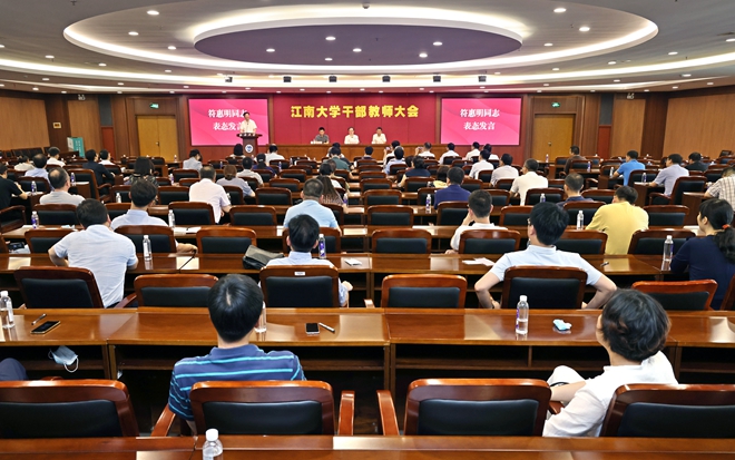7月14日上午,我校在图书馆五楼召开干部教师大会,宣布教育部党组、教育部关于江南大学校领导班子副职的任免决定。校党委副书记戴月波主持会议。