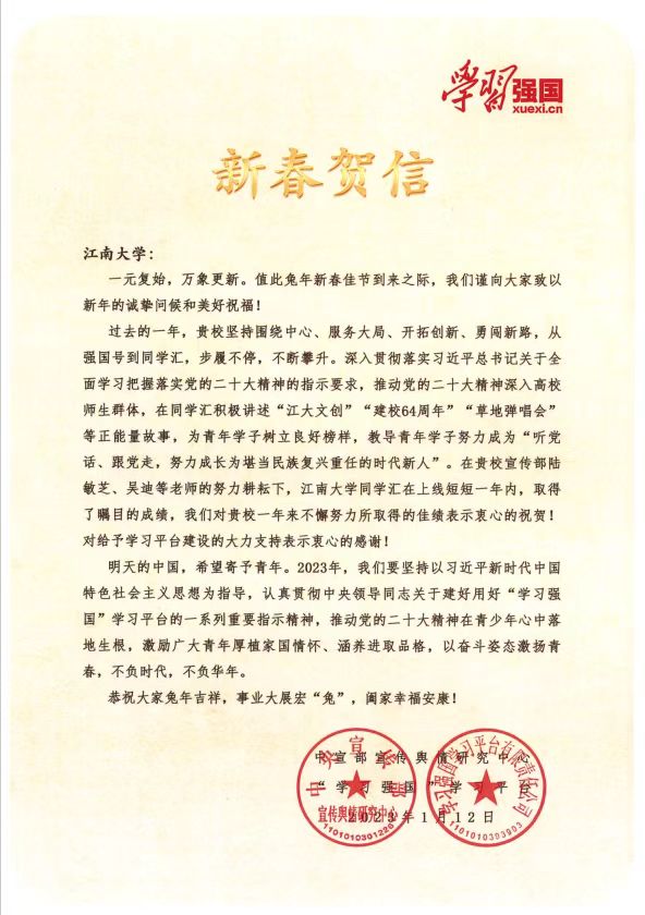 中宣部宣传舆情研究中心、“学习强国”学习平台发来的新春贺信,对过去一年学校学习强国“同学汇”取得的优异成绩表示祝贺和肯定。贺信指出,过去的一年,江南大学坚持围绕中心、服务大局、开拓创新、勇闯新路,从强国号到同学汇,步履不停,不断攀升。深入贯彻落实习近平总书记关于全面学习把握落实党的二十大精神的指示要求,推动党的二十大精神深入高校师生群体,在同学汇积极讲述“江大文创”“建校64周年”“草地弹唱会”等正能量故事,为青年学子树立良好榜样,教导青年学子努力成为“听党话、跟党走,努力成长为堪当民族复兴重任的时代新人”。