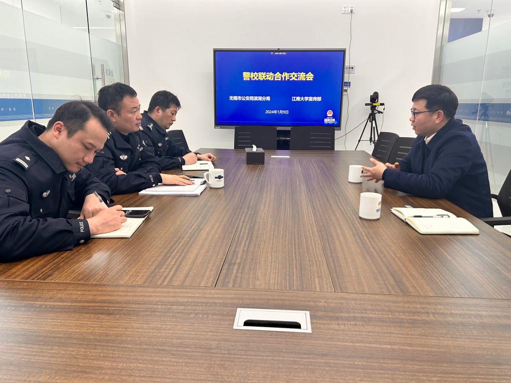 在无锡滨湖公安合成作战(数鹰)中心,胡振宇一行参观了舆情中心、网络侦防部等平台,与滨湖公安分局党委委员、政治处主任浦景林及网安大队倪宏明、邹继强等进行座谈交流。胡振宇对滨湖分局网安大队长期以来给予江南大学在有关舆情处置、反诈宣传等方面的关心支持表示感谢。他介绍了江南大学党委宣传部、融媒体中心相关情况。结合工作实际,双方围绕网络舆情处置联动、网络文明宣教前置、网络宣传合作交流等进行了深入探讨。