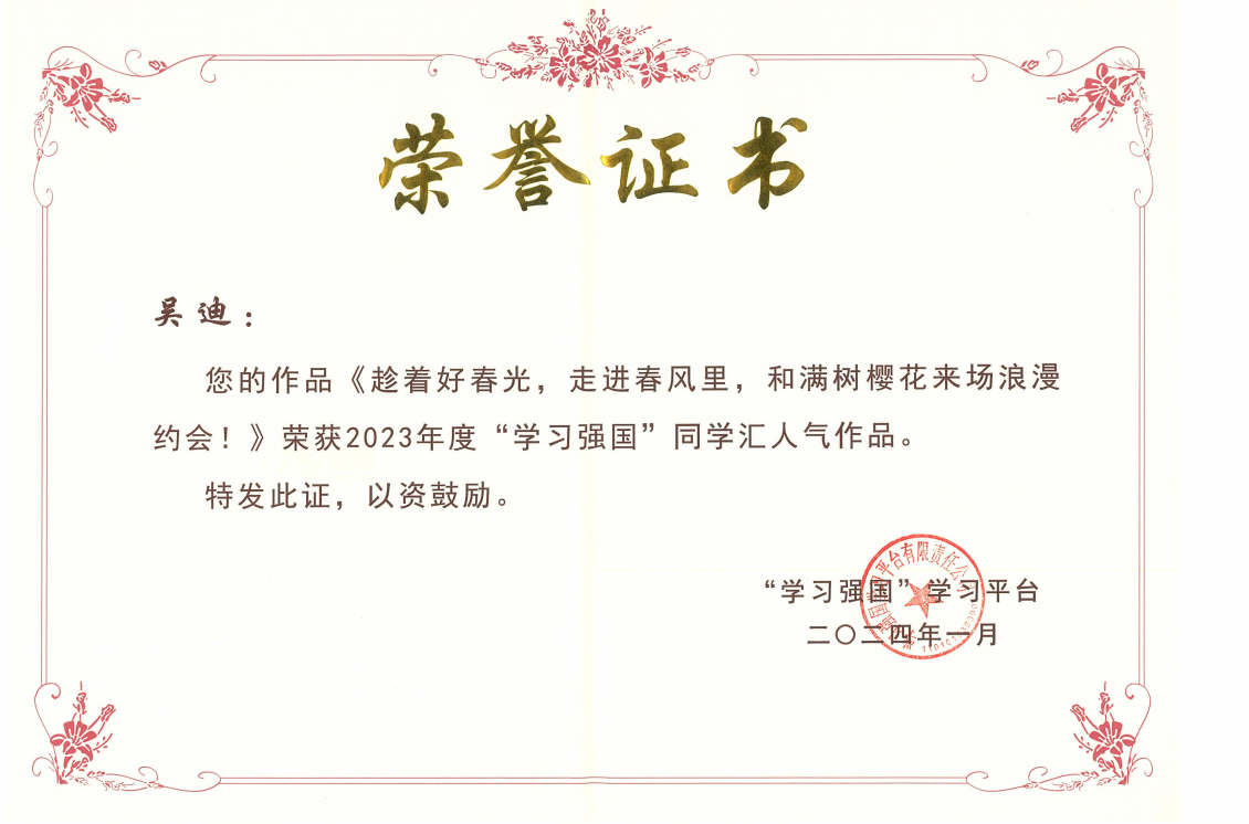 近日,“学习强国”学习平台公布了2023年度表彰结果。江南大学获评“学习强国”同学汇2023年度先进单位,系我校首次获得该项荣誉。《趁着好春光,走进春风里,和满树樱花来场浪漫约会!》入选同学汇年度人气作品,融媒体中心主任兼党委宣传部副部长胡振宇老师获评优秀管理员。