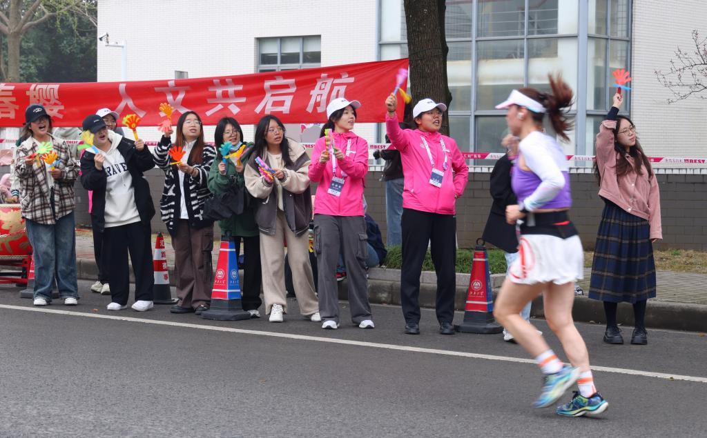 上午7点55分左右,参赛选手自南门进入我校。赛道两旁站满了观赛的师生,各学院师生和社团组织也纷纷拉起横幅,手持加油牌,为选手们鼓掌喝彩。阵阵加油声中,选手们或敞开双臂迎接欢呼,或与观众击掌互动,或隔空“比心”,或配合“比耶”留影......热情高涨的赛道见证了校园内外的双向奔赴。激情与欢乐交替上演,热血与温暖齐头并进,选手们目光坚定,向终点昂扬进发。
